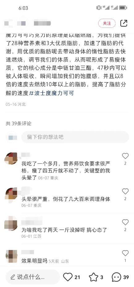 不过面对魔力可可如此自信的减肥承诺,我们也收集了很多魔力可可消费者的真实反馈,有部分人群表明自己在吃魔力可可时,必须严格执行营养师所提供的食谱,也就是与生酮饮食特点相似的高脂肪中蛋白低碳水的饮食,不过有人对营养师的专业程度表示怀疑;另外有部分人群认为自己在食用魔力可可后出现了很多副作用,比如心慌心悸失眠食欲不振等;还有部分人食用魔力可可后没有变瘦反而长胖。