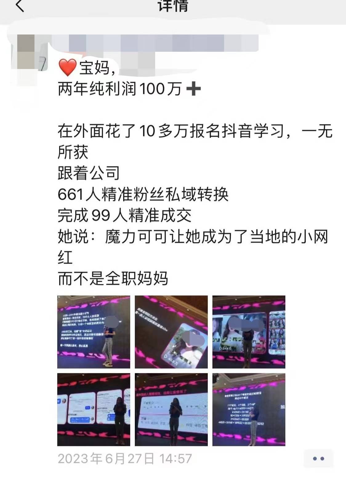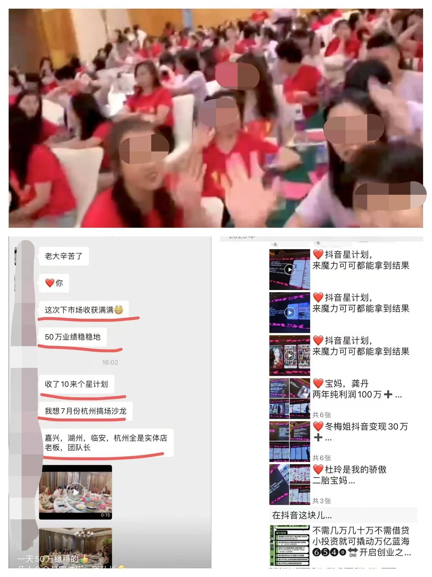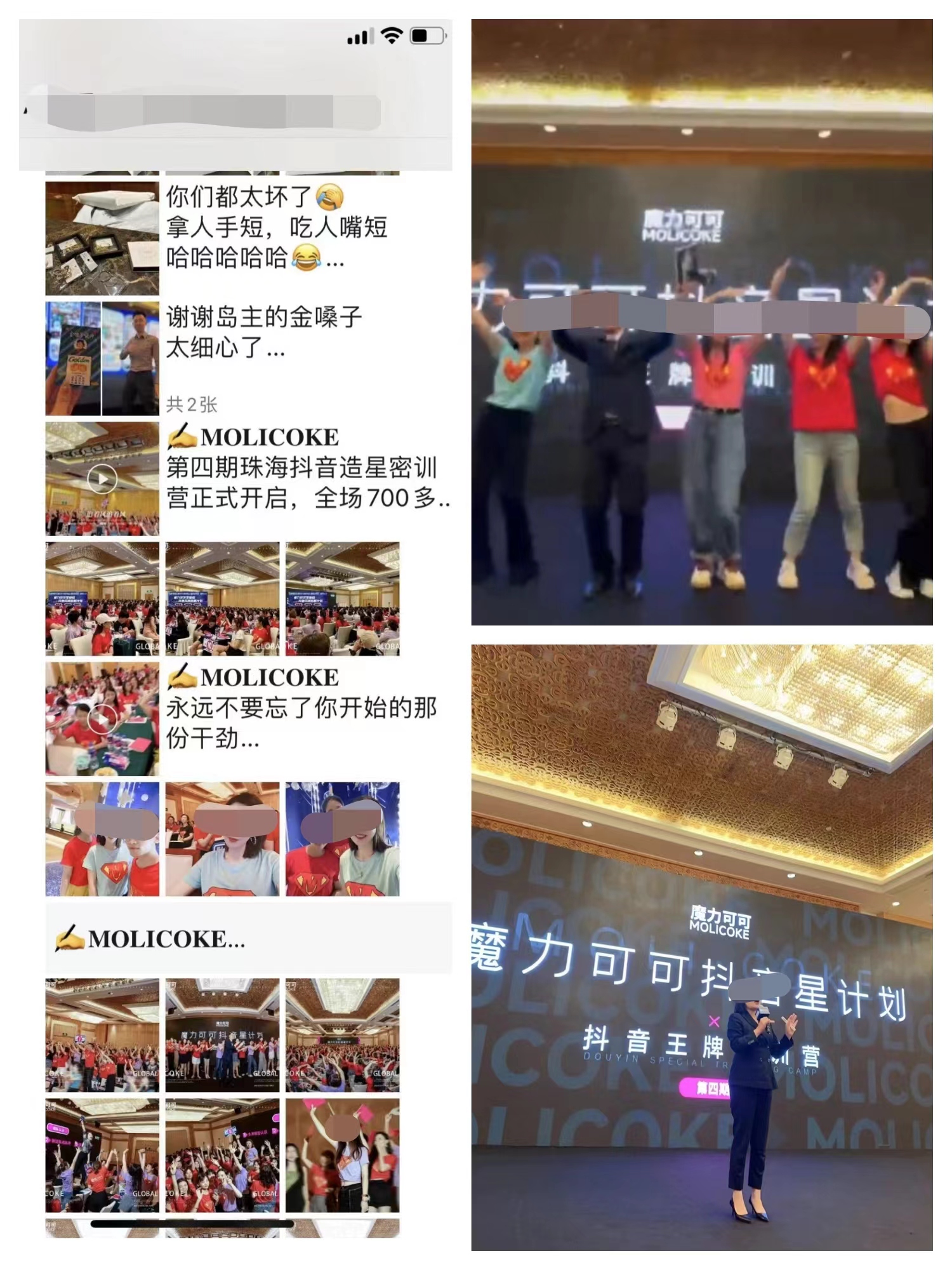 然而,根据网友反映,原本“偃旗息鼓”的“魔力可可”近期又开始在珠海等地大规模“密训”、“开会”招募新的代理。这次,他们在原有模式不变的情况下,开设了“抖音造星计划”,将对象瞄准“宝妈”群体,号称能够在短视频平台精准转化粉丝,打造网红的同时完成产品销售,获得更大利润。