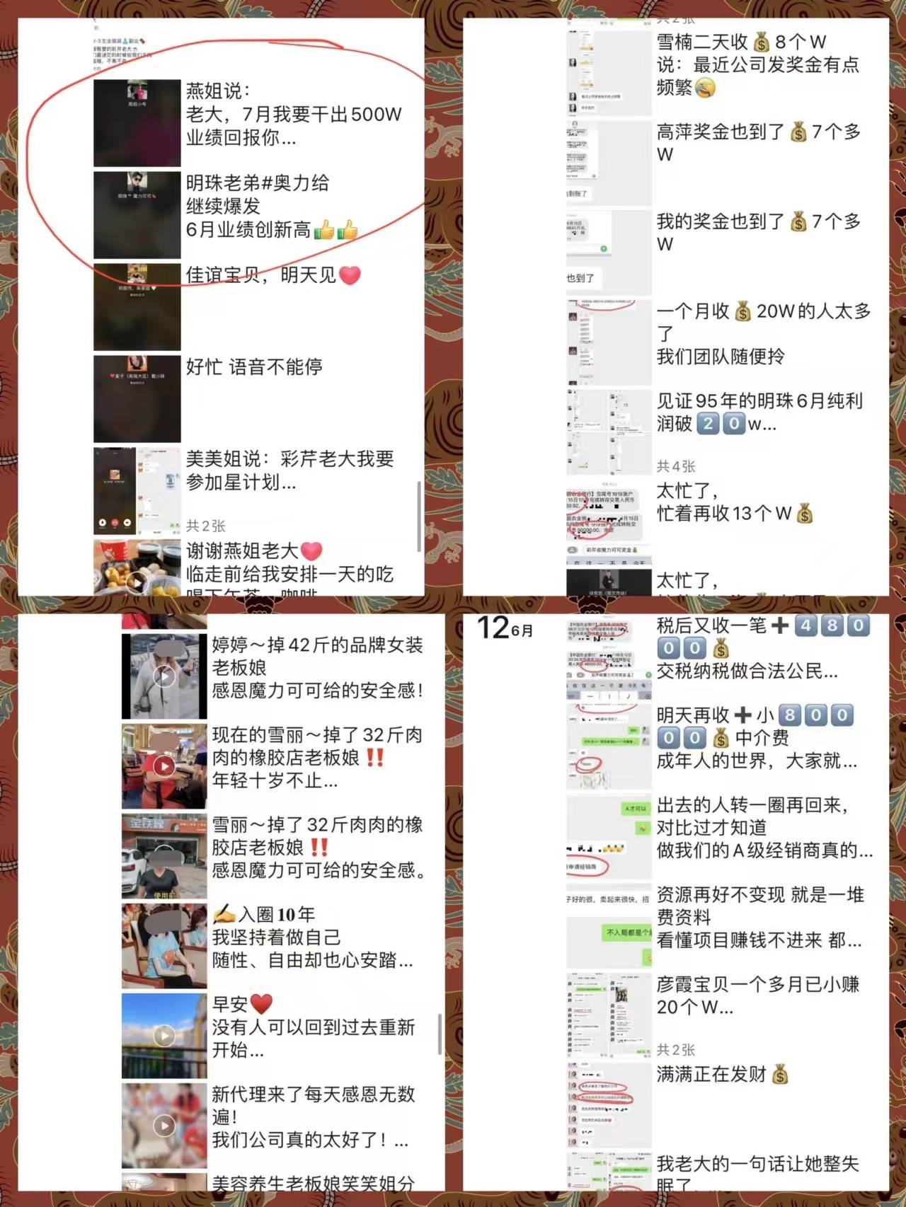 为了完成团队业绩获得更高的利润,团长不断拉新人,小代理们纷纷囤货刷业绩,看似流水被做得“漂漂亮亮”,实则都是代理们自掏腰包。就算奖金能够如数发放,也远远不能填补代理们不断支出的本金。