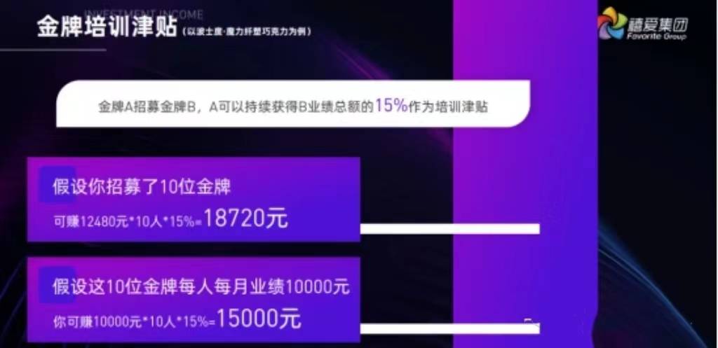 与此同时,“魔力可可”还设置了十分诱人的团队业绩分红制度,每招募一位新代理,上级都可以拿到相应报酬。例如:金牌A招募了金牌B,那么A就可以持续获得B业绩总额的15%作为培训津贴。
