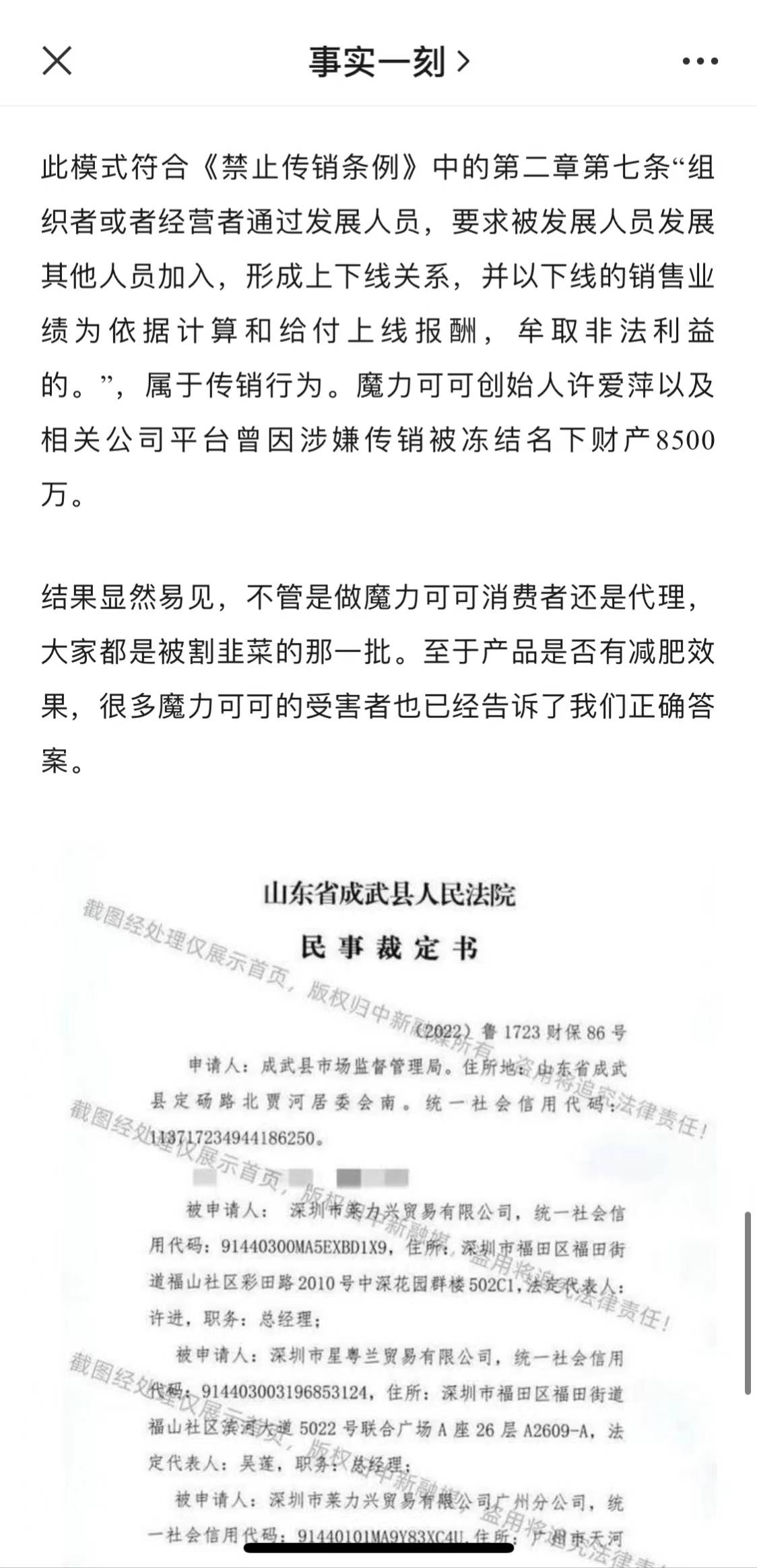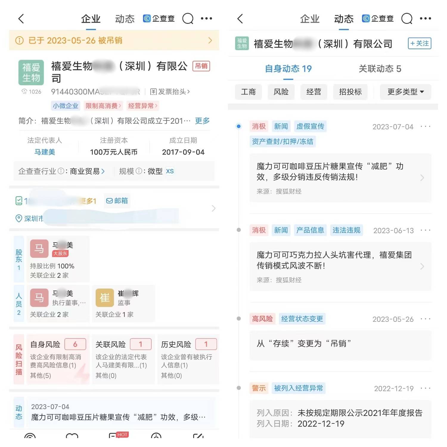 果不其然,当我们查找“魔力可可”的主体公司“禧爱生物某某(深圳)有限公司”,发现该公司被限制高消费,并因经营异常在2023年5月已被吊销。而“魔力可可”创始人许某以及相关公司“深圳市莱力兴某某有限公司”也因涉嫌传销被冻结财产8500万元。