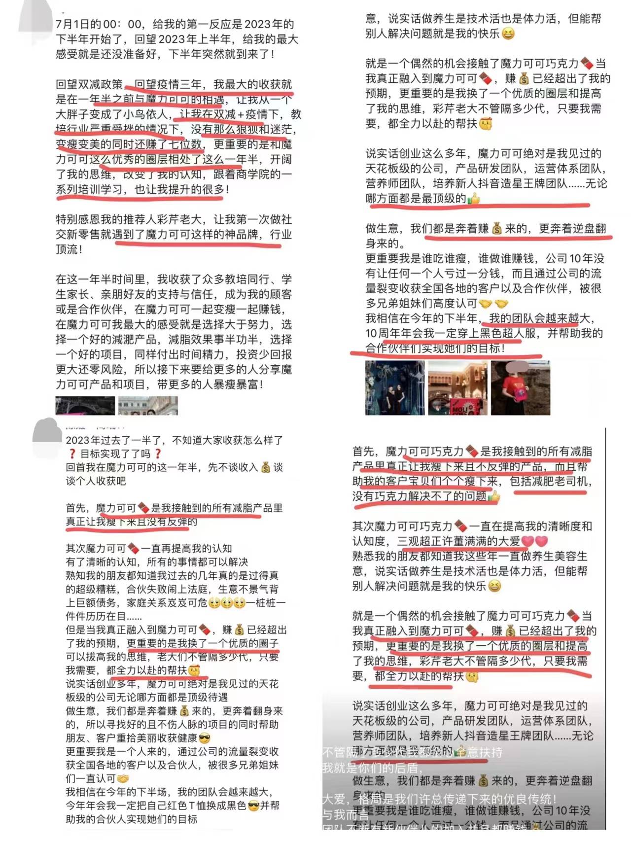 根据“魔力可可”的宣传资料介绍,这些产品能够让人7天瘦10斤,并且做到减肥不反弹。同时,该产品在全国代理众多,每一位代理似乎都在短时间实现了财富自由,朋友圈里充斥着各种购买奢侈品或百万豪车的记录。仿佛只要加入“魔力可可”,赚钱就像捡石子一样简单。