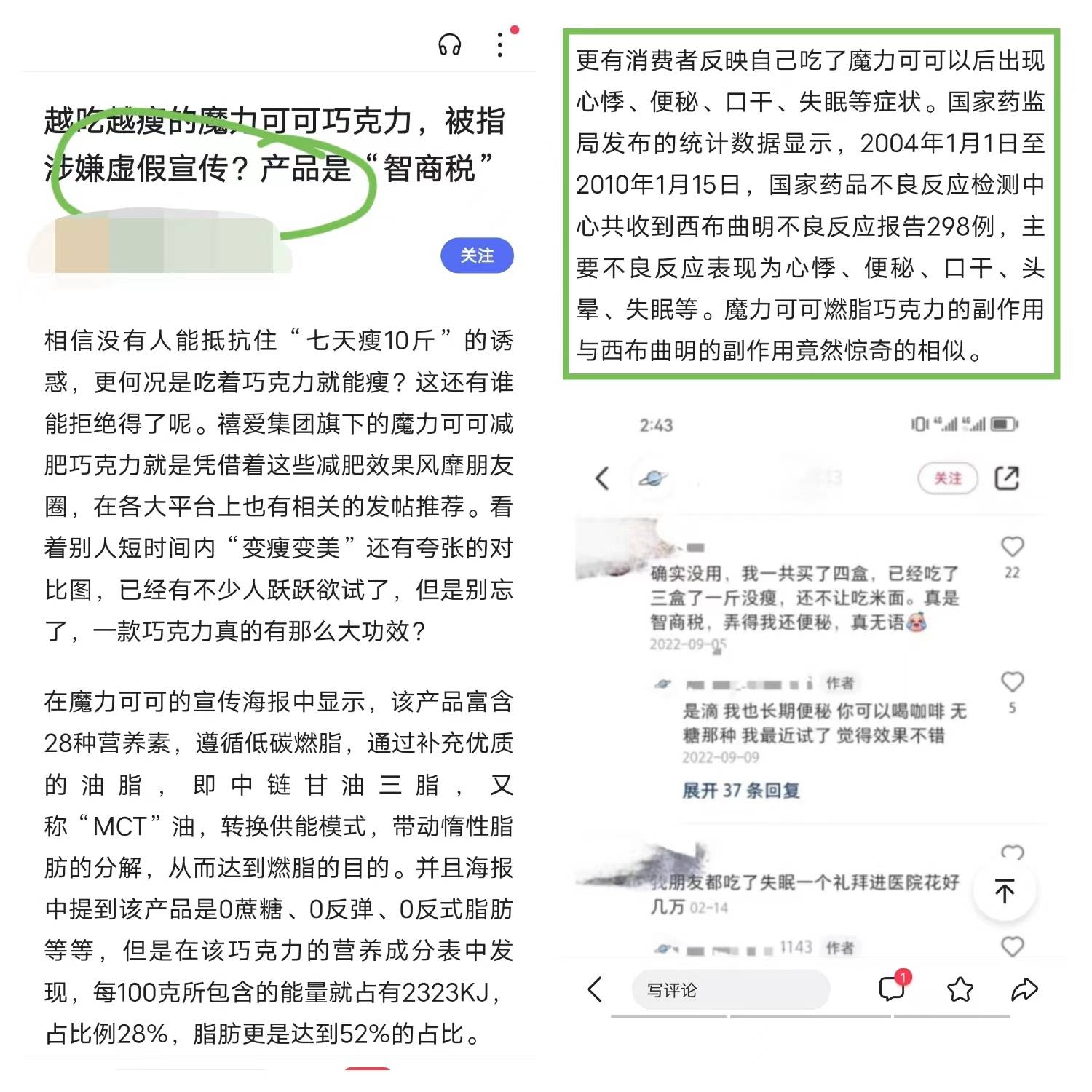 在网上,大量”魔力可可“的宣传语都表示这是一款十分健康的减肥产品,但是,不少使用过该产品的消费者称吃完不但没有瘦,反而还胖了,而且副作用明显。有些食用过后确实瘦了的网友也称,根据”魔力可可”提供的指导食谱吃饭,即使不吃这款产品,也能达到瘦身目的。可见,“魔力可可”存在虚假宣传的嫌疑。