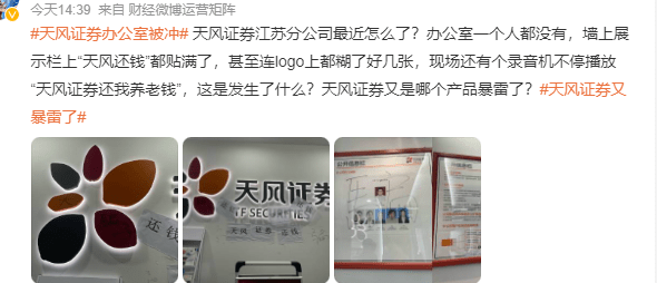 7月5日,有微博网友爆料,天风证券(股票代码:601162)江苏分公司人去楼空,爆料图片中,天风证券的前台被贴满了“骗子”“还我养老钱”等字样,话题#天风证券办公室被冲#阅读量2.7万。