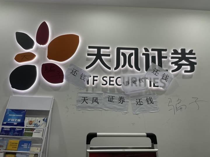 有网友来到天风证券江苏分公司并拍摄视频,视频中前台的logo处和办公室内几乎所有墙上都被A4纸贴满了,上面写着“天风证券还钱”“养老钱”等字样,墙上和logo上均用黑色马克笔写上“骗子”的字样,边上的员工展示栏上也用马克笔上写上了大号的“骗子”,并且视频中一直有大喇叭在不停循环播放:“天风证券还我养老钱”。