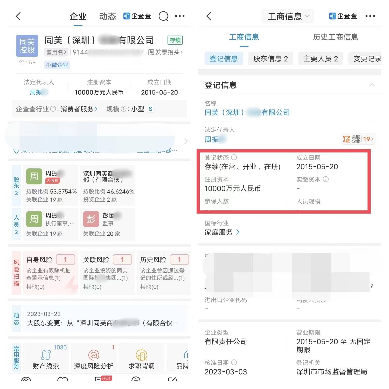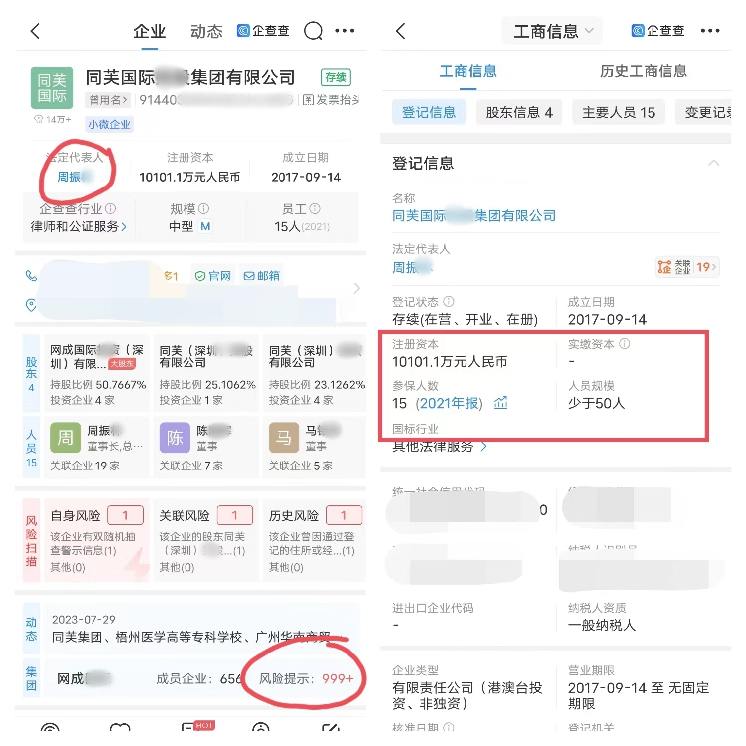根据企查查显示,“同芙国际某某集团有限公司”法人周振某,该公司注册资本高达10101.1万元,但是,实缴资本竟然是0,其风险提示也高达999+。旗下“同芙(深圳)某某有限公司”也仅是一家注册资本10000万元、实缴为0、参保人员为0的空壳公司。其法人周振某名下有多家企业,状态与这两家公司基本相同,注册资本都很高,但实缴均为0。