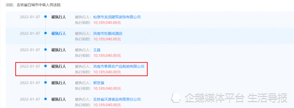 2022年1月7日洮南泰昌农产品公司被吉林省白城市中级人民法院列为被执行人,执行标的为10189040元。