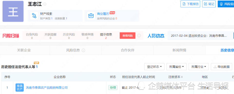 2017年11月3日,王志江将洮南市泰昌农产品购销有限公司(下称洮南泰昌农产品)3368万元股权数额质押给了洮南农信社,目前质押为有效状态,王志江曾为该公司法人。