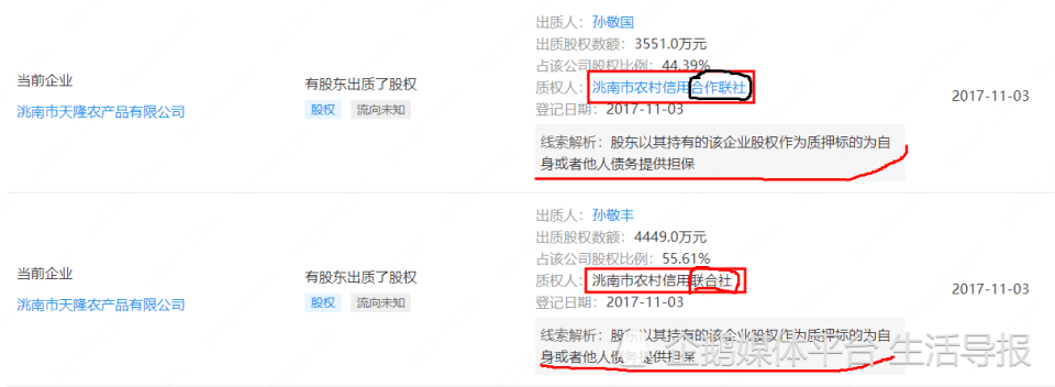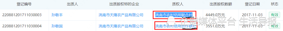 2017年11月3日,洮南市天隆农产品有限公司股东孙敬国将该公司3551万元股权数额出质给洮南市农村信用合作联社,而意外的是同日,该公司另外一个股东孙敬丰将该公司的4449万元的股权数额出质给洮南市农村信用联合社。这两家名字近似的金融机构是否合法?是否同一家金融机构?一家注册资金仅为500万的公司股权价值8000万元是否靠谱?其经营情况是否真实有效?