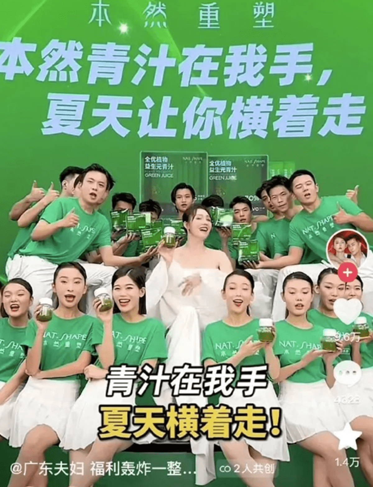 据媒体报道称,“广东夫妇”宣称青汁饮料“致力于曲线管理人群”“肚子不通畅,三五天不上厕所”时就喝它,并且具有“针对体态问题,帮助管理腰部、臀部位置”的功效。在“广东夫妇”账号的一段视频中,“老公”郑建鹏感慨自己几个月之前怎么这么胖!然后表示,“但当我遇见了它(本然青汁),于是我不停地喝,就变成了……”后面的内容没有文字和配音,只是配以了很多张郑建鹏减肥成功的图片。另外,在视频的文案中,郑建鹏还描述,“每顿饭前都喝本然超模青汁”“90%靠饮食瘦。”