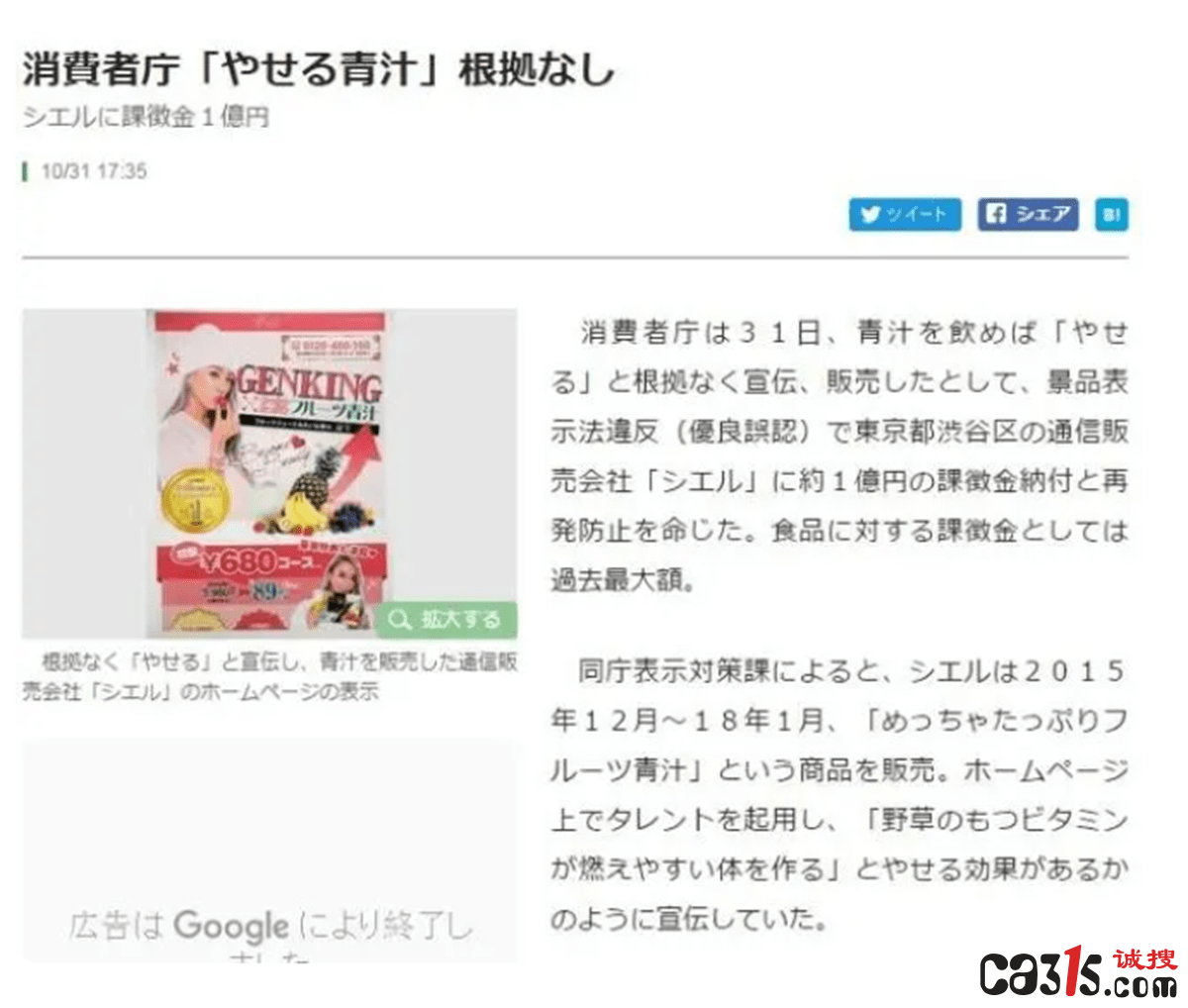 然而,针对青汁具备“神奇功效”的说法却饱受争议。3.15诚搜网调查发现,早在2018年,日本政府就以喝“青汁”可以减肥的广告宣传缺乏依据、涉嫌违反日本《景品表示法》(类似于我国的广告法)为由,对相关企业处罚1亿日元,创造历史纪录。