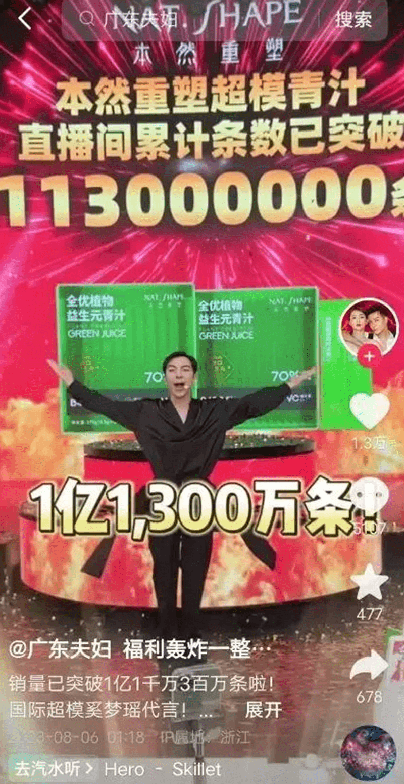 公开资料显示,售价149元的本然青汁,在“广东夫妇”直播间卖出了1亿1300万条。按照180条/单,单价149元计算,其销售额已经突破了1亿元。