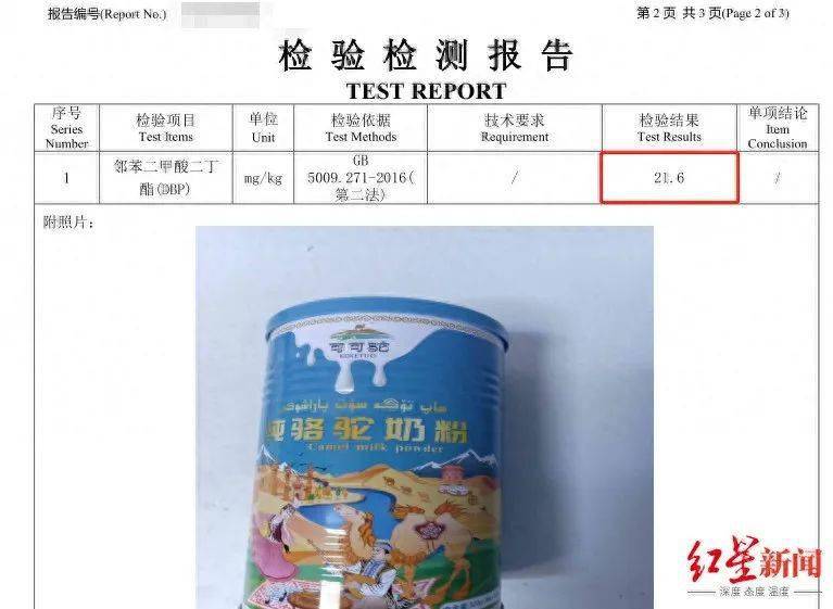 王海助理提供给记者的检测报告显示,该骆驼奶型号规格为320g/罐,第一批次检验日期为6月18日至19日,检测出邻苯二甲酸二丁酯(DBP)含量为21.6mg/kg;第二批次检测日期为7月10日至11日,邻苯二甲酸二丁酯(DBP)含量为0.81mg/kg。