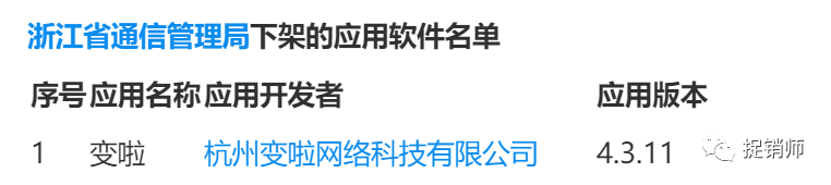 其中浙江省通信管理局下架的应用软件名单中杭州变啦网络科技有限公司的变啦APP赫然在列。