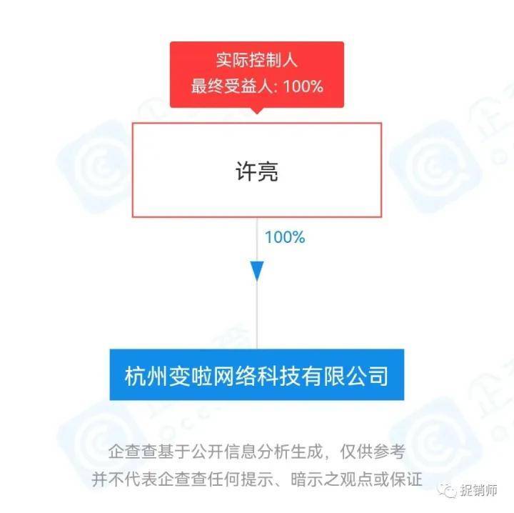 据企查查APP数据显示,杭州变啦网络科技有限公司成立于2016年1月14日,法人许亮持股100%。