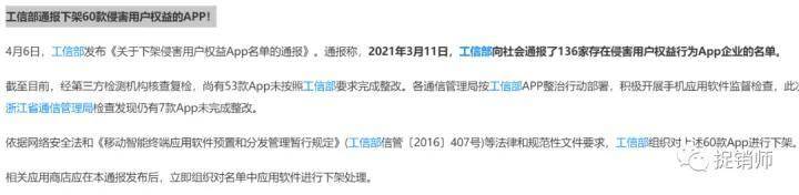 2021年4月15日,工信部通报下架60款侵害用户权益的APP,据称:4月6日,工信部发布《关于下架侵害用户权益App名单的通报》。通报称,2021年3月11日,工信部向社会通报了136家存在侵害用户权益行为App企业的名单。截至目前,经第三方检测机构核查复检,尚有53款App未按照工信部要求完成整改。各通信管理局按工信部APP整治行动部署,积极开展手机应用软件监督检查,此次浙江省通信管理局检查发现仍有7款App未完成整改。依据网络安全法和《移动智能终端应用软件预置和分发管理暂行规定》(工信部信管〔2016〕407号)等法律和规范性文件要求,工信部组织对上述60款App进行下架。相关应用商店应在本通报发布后,立即组织对名单中应用软件进行下架处理。