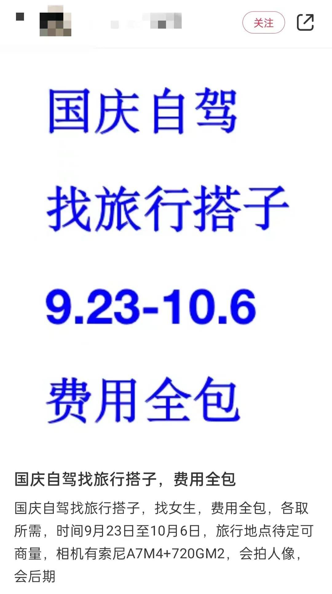 除了比较隐晦的寻求旅游搭子笔记外,还有人表达得更为明目张胆。有小红书用户发布笔记表示,寻求国庆自驾游旅行搭子,找女生,费用全包,并自称会拍人像,会后期。点开他的主页,会发现他还会给女生拍摄私房照,并曾放出自己拍摄的美女照片,以吸引女性关注。