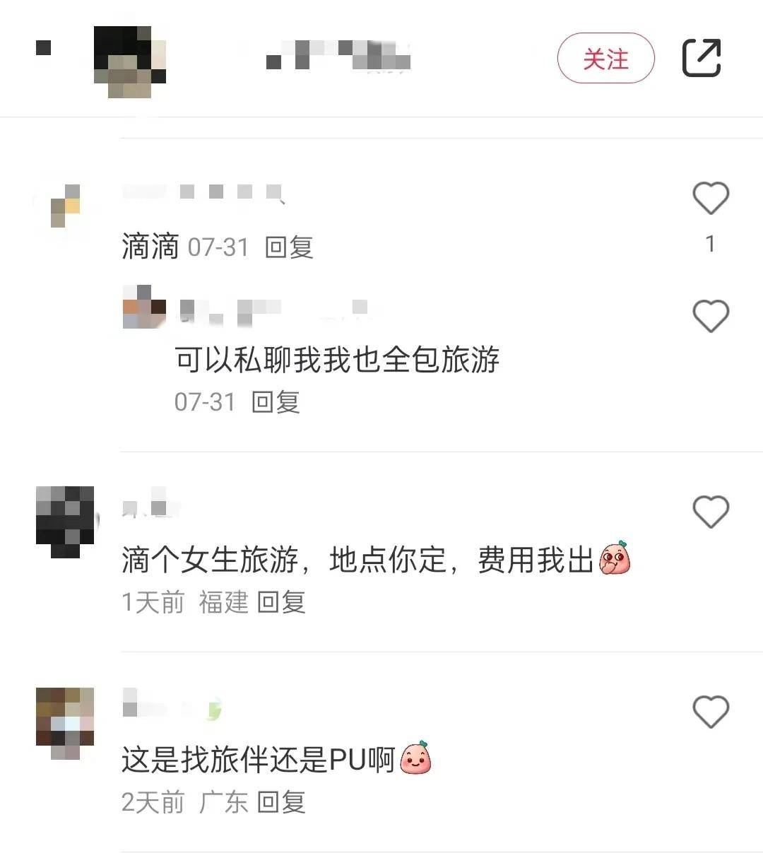 这样的评论留言还有很多,譬如“我找个旅游伴侣,费用全包,每天会吐金币”;“贵州周边省都可以旅游,费用我全出,我有车自驾游,飞机高铁都可以,懂事就行。”“88大叔,时间财务自由全国自驾游,蹲个妹妹一起玩,可吐金币。”这名用户的主页中也含有寻找旅游搭子内容。除了旅游,还有多个寻求长期固定关系的信息,表示“互不干涉生活”。