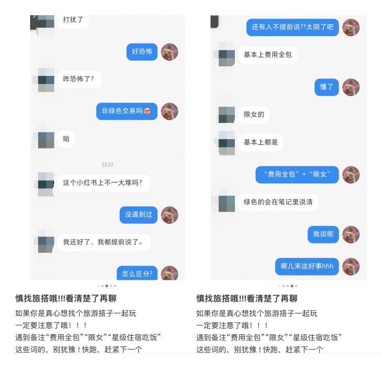 记者注意到,有网友发帖表示“慎找旅搭,看清楚了再聊”。该网友称,“如果你是真心想找个旅游搭子一起玩,一定要注意了,遇到备注‘费用全包’‘限女’‘星级住宿吃饭’这些词的,别犹豫,快跑,赶紧下一个,因为这些相当于一个暗号”。