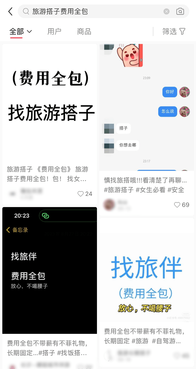 “蹲一个旅游搭子,费用全包,各取所需(只限女生)”“关于绿不绿,懂得都懂,不懂私我”……8月30日,海报新闻记者尝试在小红书平台搜索“旅游搭子费用全包”关键词,发现相关内容。