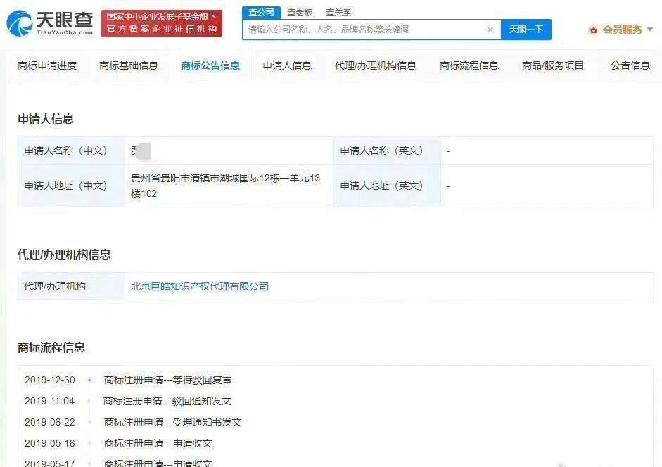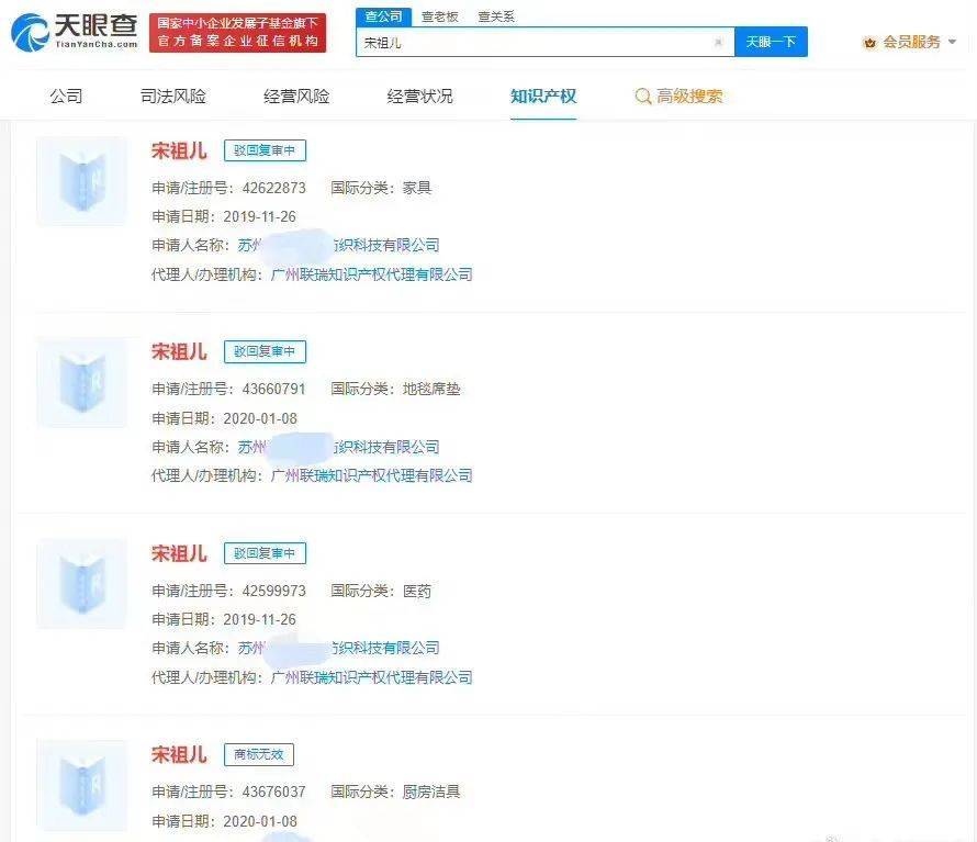 天眼查App显示,抢注宋祖儿商标均被驳回,自然人罗某和苏州某纺织科技公司曾于2019年、2020年申请20余枚“宋祖儿”商标,国际分类包括服装鞋帽、家具、广告销售等。目前,这些商标均已被驳回或处于无效状态。