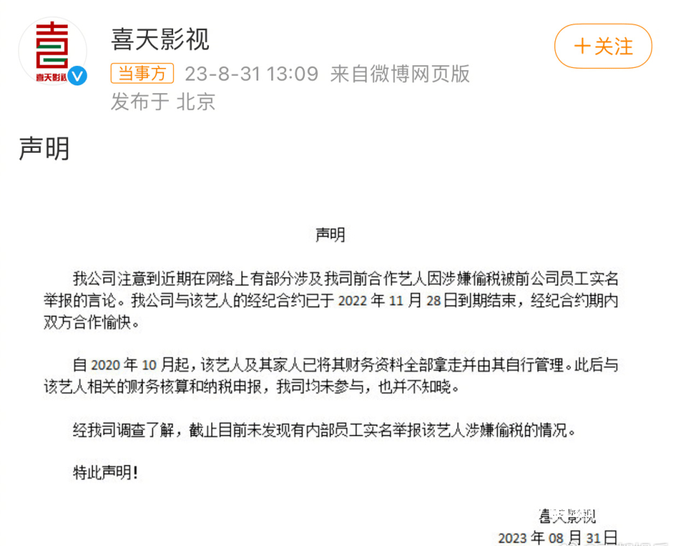 8月31日下午1点,宋祖儿之前的合作公司喜天影视发布声明,称其与宋祖儿的合约于2022年11月28日到期结束,且自2020年10月起,该艺人与其家人已拿走全部财务资料自行管理。喜天影视均未参与,并不知晓。该公司表示,经调查了解,截至目前未发现有内部员工实名举报宋祖儿涉嫌偷税的情况。