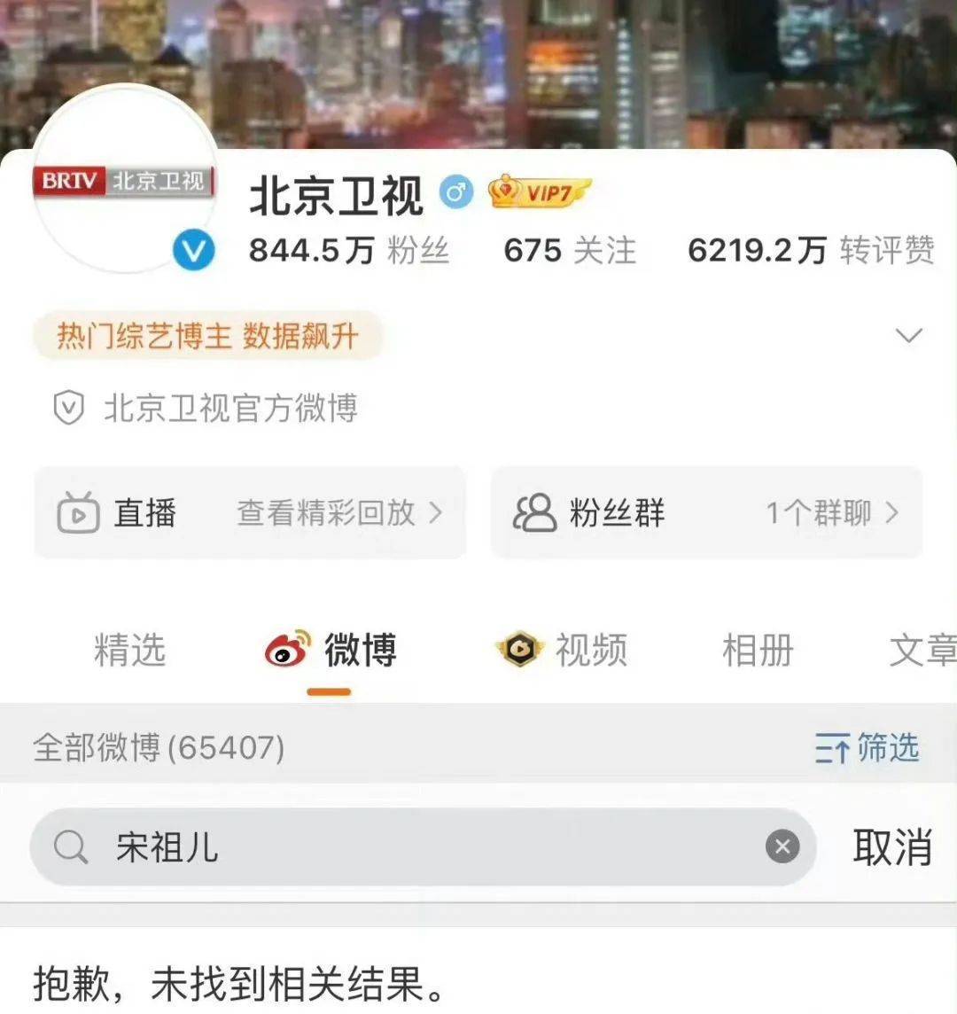 8月31日,网传宋祖儿被举报逃税的消息引发全网关注。有网友发现,湖南卫视、浙江卫视、北京卫视、江苏卫视、安徽卫视等官微均已搜索不到宋祖儿相关的微博。