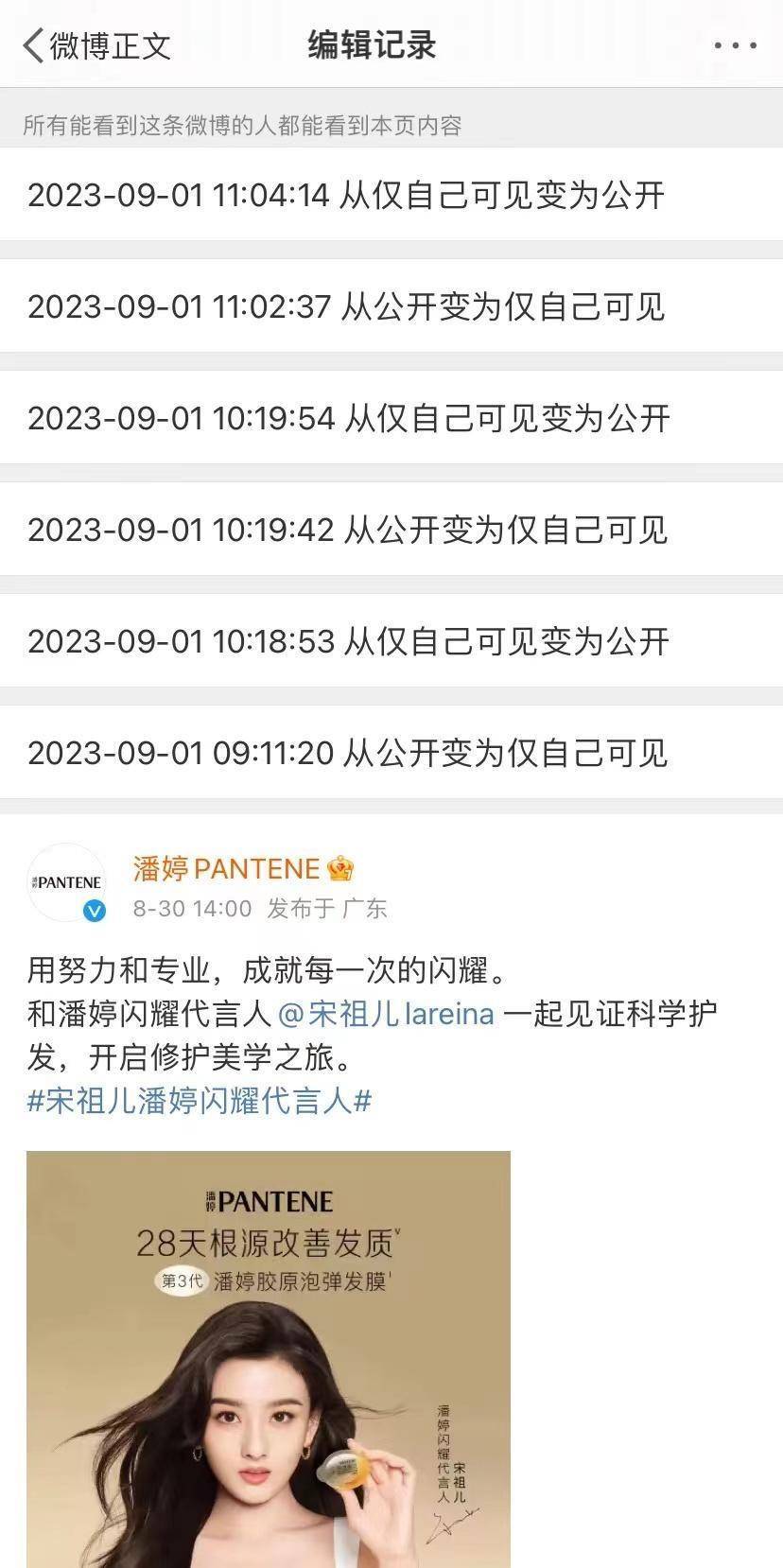 潘婷官微多次修改了宋祖儿代言物料,反复从公开转为自己所见又公开。据悉,8月30日潘婷刚官宣宋祖儿为其代言人,并宣布9月3日宋祖儿将现身潘婷天猫旗舰店直播间。