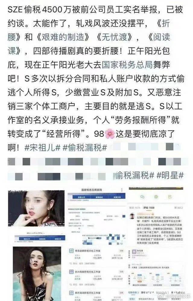 该名爆料者称目前宋祖儿已被带走约谈,其避税方式是通过拆分合同和利用私人账户收款。另外,宋祖儿为了片酬问题还注销了3家公司,利用工作室的名义接戏,所以钱的来源就变了性质。