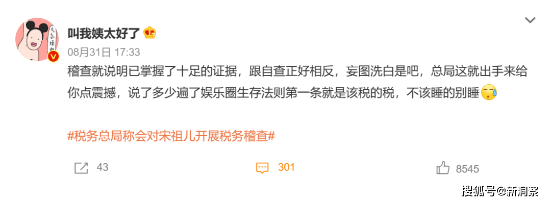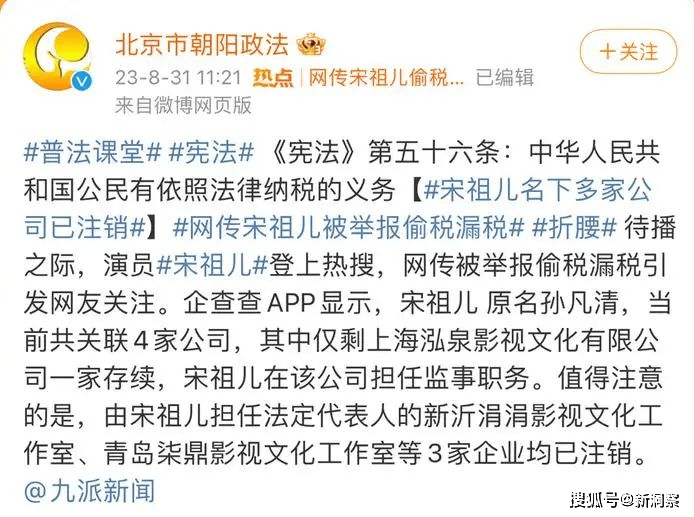 8月31日中午,官方都已经介入,@北京市朝阳政法 针对宋祖儿涉嫌偷税漏税事件发声,官方明确指出公民有依法纳税的义务。不少人猜测,宋祖儿偷漏税一事恐怕已经实锤。