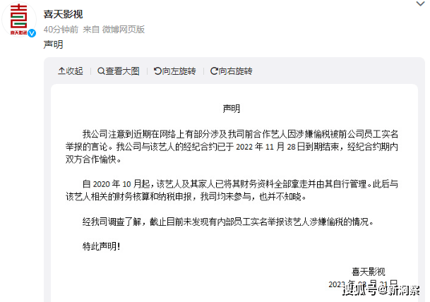 据喜天影视称,宋祖儿和她家人的东西全部移交,不是喜天员工举报的。而且2022年合约到期,2020年财务资料全部拿走!以上发生的事情,公司并不知情。