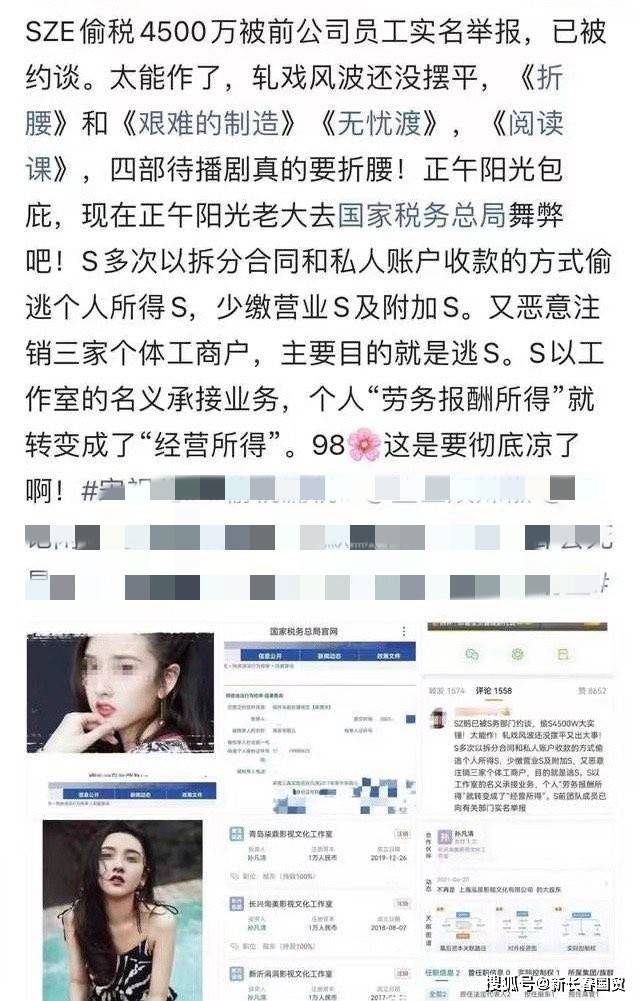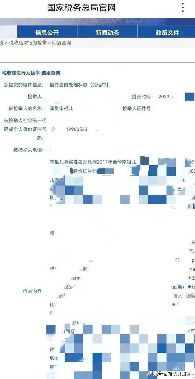 8月31日,有网友爆料称,演员宋祖儿被举报税务问题,涉及金额4500万元。从网传截图及信息可以看出,疑似宋祖儿公司前员工通过国家税务总局官网“税收违法行为检举”一栏对其进行了实名举报。据报道,宋祖儿共关联4家企业,其中3家公司已注销,仅剩关联企业其持股比例也由99%变更至10%。