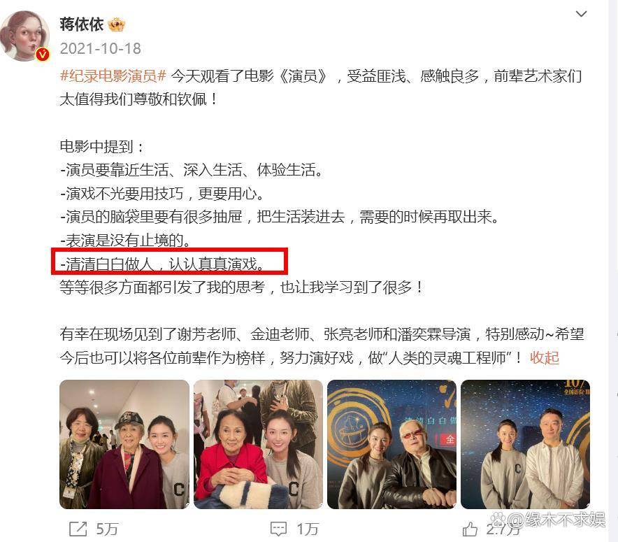 2021年,蒋依依写了电影《演员》观后感,也表示要 “清清白白做人,认认真真演戏”,会努力演好戏,做人类灵魂的工程师。