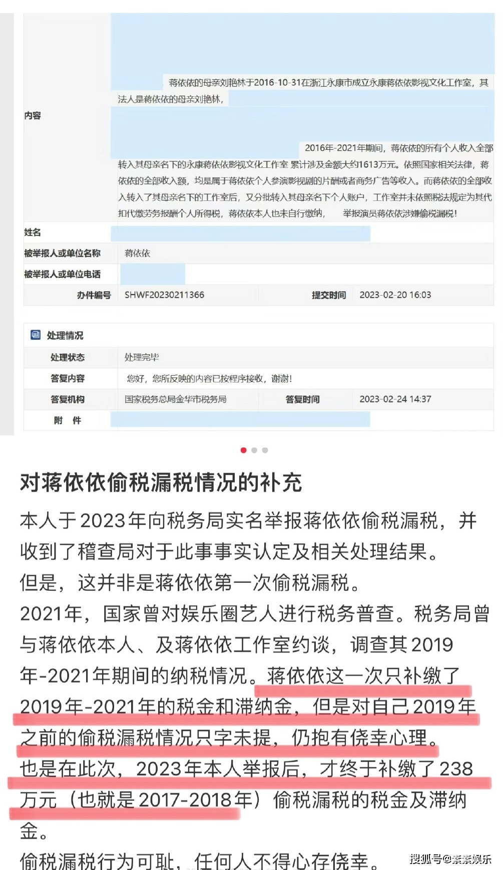 举报网友表示蒋依依在2021年之前,对于偷漏税的问题抱着侥幸的心理,在举报人2023年进行材料的补递之后,她才补交了200多万。