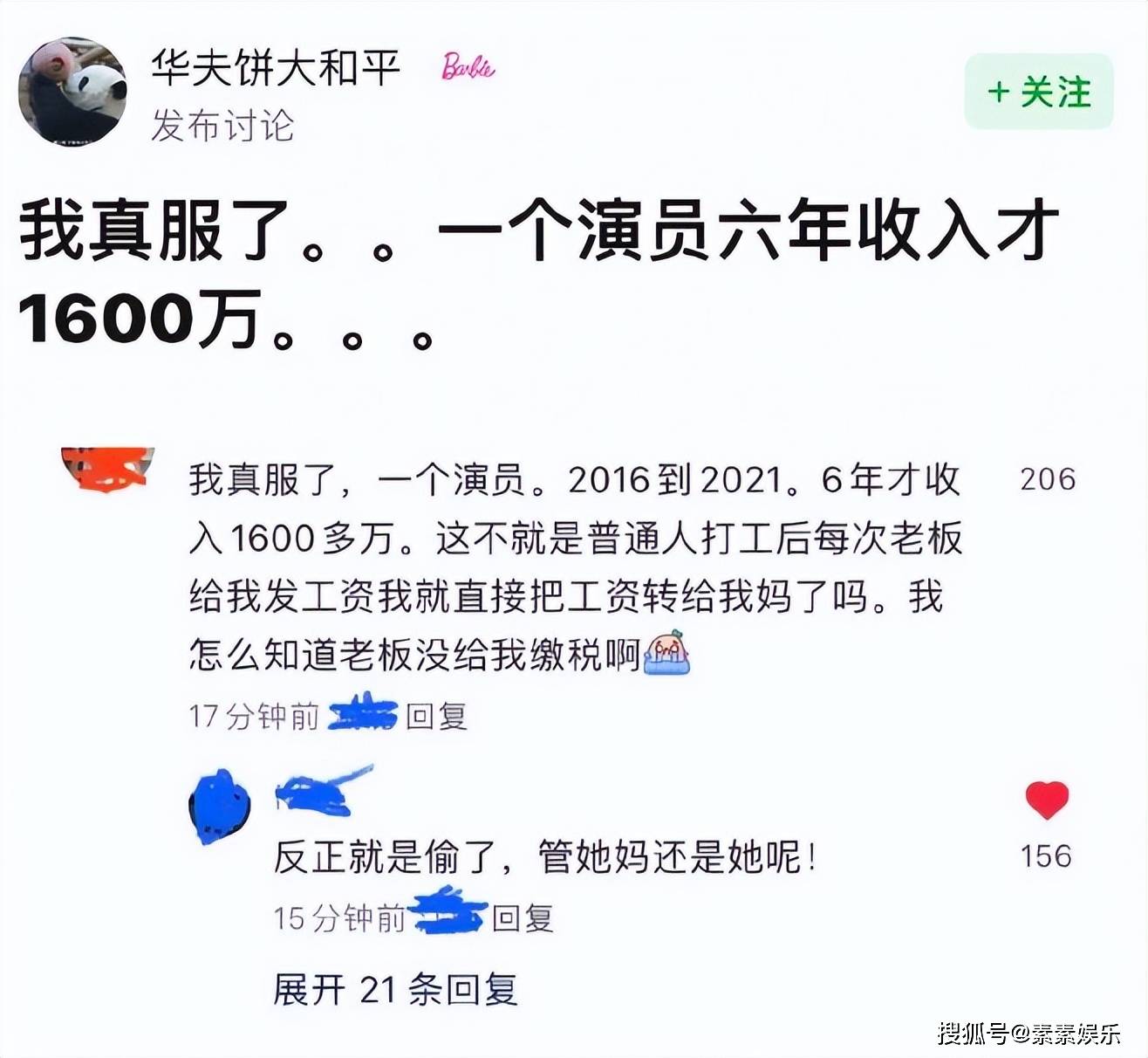 网友的形容是:我真服了,一个演员六年收入才1600万。