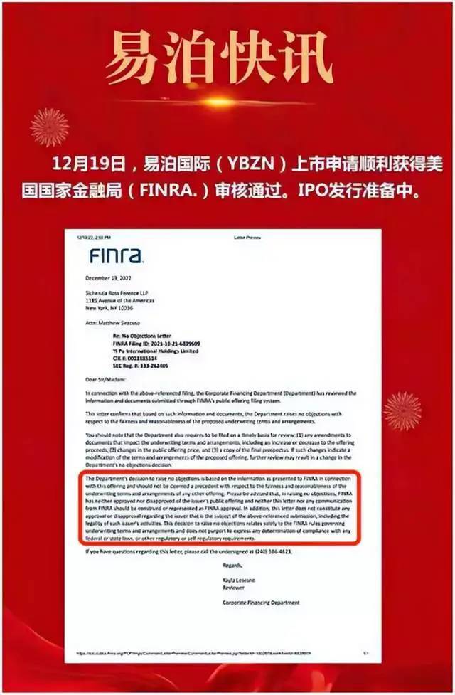 该司发布了一系列上市喜讯,其中易泊车智能找车位小程序一张写着“12月19日,易泊国际(YBZN)上市申请顺利获得美国国家金融局(FINRA)审核通过,IPO发行准备中。”