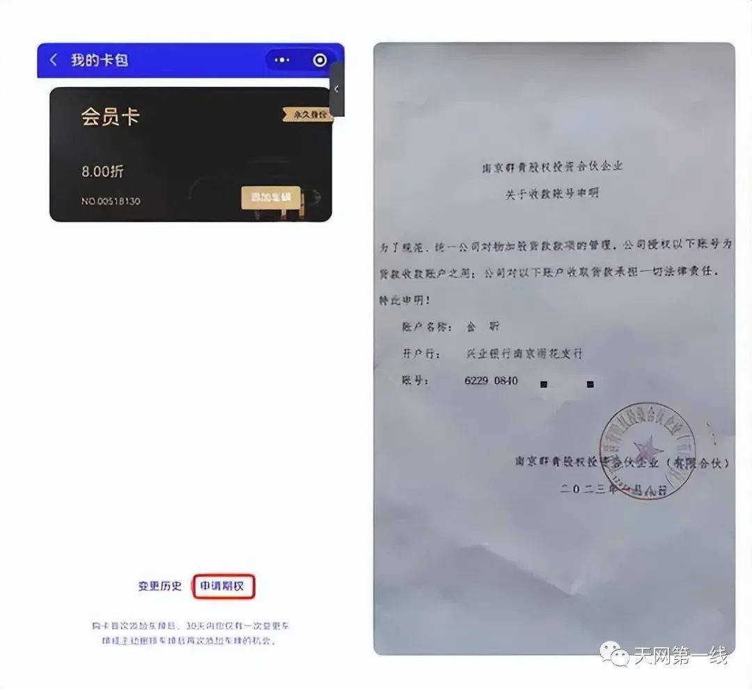 一份南京群青股权投资合伙企业2023年1月8日的收款账号申明,该申明显示;“为规范、统一公司对物加股货款款项的管理,公司授权以下账号为货款收款账户之用;公司对以下账户收取货款承担一切法律责任。特此申明!”账户是金昕的个人银行账户,开户行:兴业银行南京雨花路支行。帐号:622908xx。
