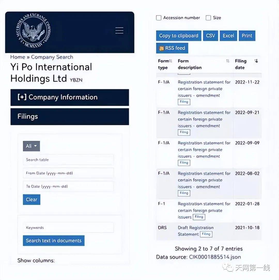 登陆美国证券交易委员会官网(以下简称SEC):http://www.sec.gov,在其官网上进行关键词“YBZN”与“Yi Po International Holdings Limited”检索,查询到,易泊国际控股集团于2021年10月18日首次递交DRS文件,于2022年1月28日首次递交F-1文件,2022年8月至12月这4个月内递交5轮F-1/A文件。