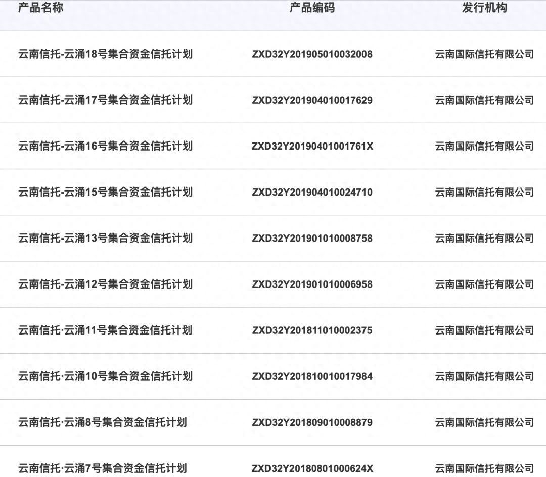 其中,云涌系列信托项目共计11 个信托产品,分别为云涌1号、7号、8号、10号、11号、12号、13号、15号、16号、17号以及18号,成立时间从2018年8月起至2019年7月,产品期限均为12个月。产品到期时间为2019年8月——2020年7月。
