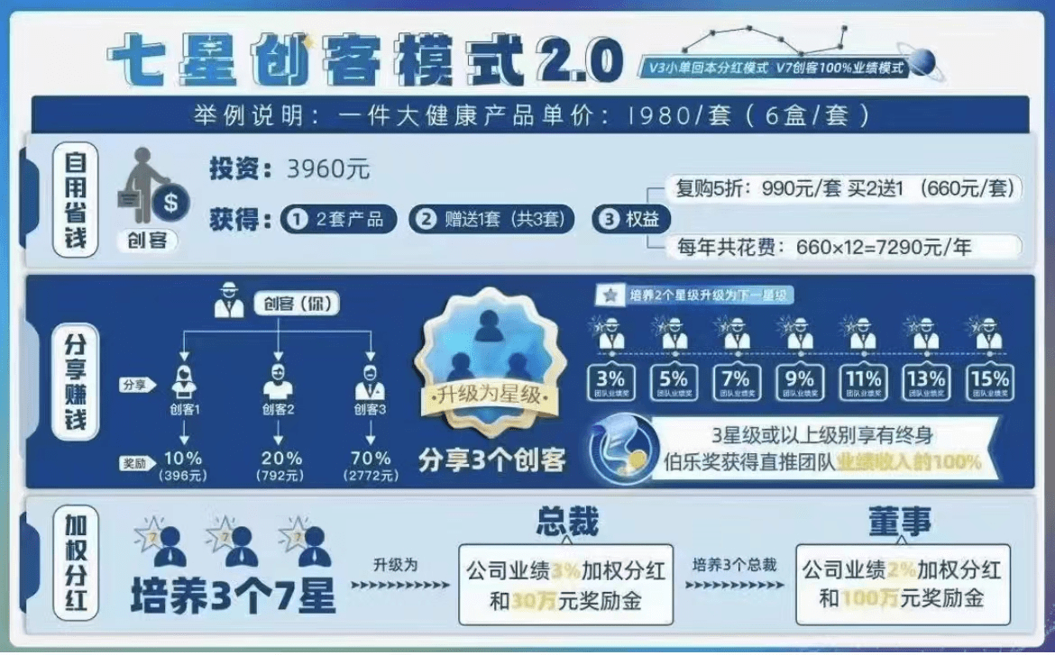 可以说,这种“七星创客”的发展模式,与《禁止传销条例》对传销特征的概括及其相似:以直接或者间接滚动发展的人员数量为依据计算和给付报酬;要求被发展人员交纳费用或者以认购商品等方式变相交纳费用;形成上下线关系,并以下线的销售业绩为依据计算和给付上线报酬。