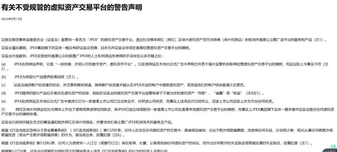 9月13日,香港证监会发出警告声明称,JPEX的虚拟资产交易平台透过网红及场外兑换店,积极地向香港公众推广该平台的服务及产品。但是,JPEX旗下实体店没有获得香港证监会牌照,同时该主体也没有向香港证监会申领在港经营虚拟资产平台的牌照。