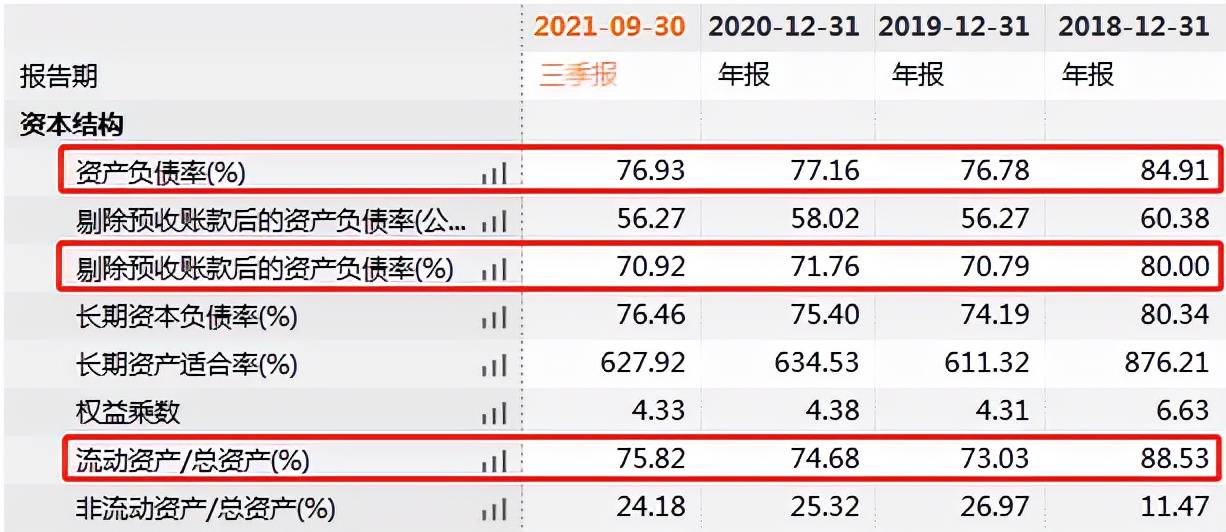 数据显示,大悦城近几年付偿能力下降。2018年-2020年及2021年前三季度,大悦城资产负债率分别为84.91%、76.78%、77.16%和76.93%,同期流动资产占比分别为88.53%、73.03%、74.68%和75.82%。