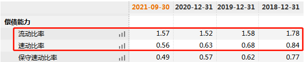 同时,wind数据显示,大悦城2018年-2020年及2021年前三季度流动比率分别为1.78、1.58、1.52和1.57,速动比率分别为0.84、0.68、0.63和0.56,2021年较前两年相比均有所下降。