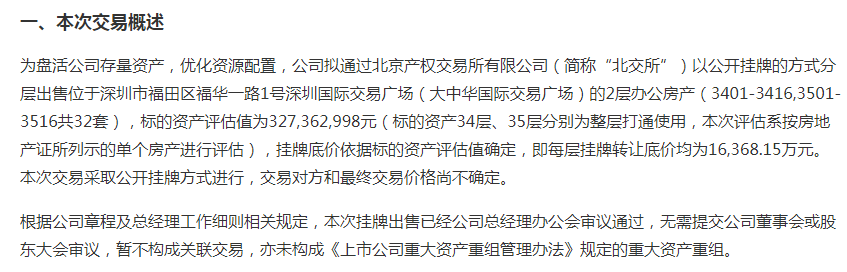 本次出售的房产为广场(大中华国际交易广场)的2层办公房产每层建筑面积4165.42平方米,合计建筑面积8330.84平方米,共计32套办公区域。大悦城委托上海东洲资产评估有限公司进行资产评估后,确定评估值约为3.27亿元(含5%增值税),增值8541.67万元,增值率35.3%。