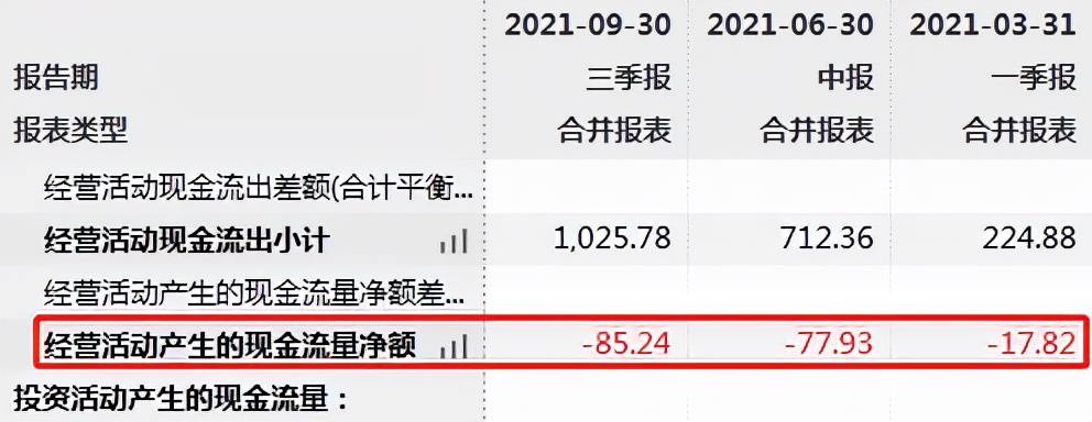 而2021年三个季度,大悦城的经营活动产生的现金流净额分别为-17.82亿元、-77.93亿元和-85.24亿元。大悦城在半年报中分析,主要为本期新获取项目土地支出、建造支出、税费支出及支付的拍地保证金净额同比增加所致。