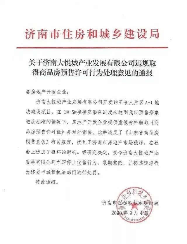 2020年9月4日,济南市住建局在官网发布一则通报指出,济南大悦城开发的王舍人片区A-1地块建设项目,在楼座形象进度未达到济南市预售形象进度标准的情况下,开发商提供虚假材料骗取《商品房预售许可证》并对外销售,这一行为违反有关规定,责令济南大悦城立即停止销售行为,限期整改,并将其违规行为移交市城管执法部门进行处罚。