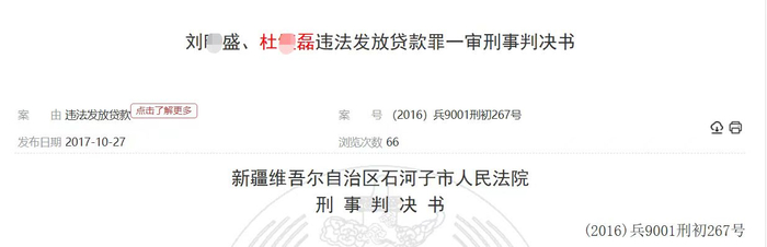 裁判文书网显示,2015年11月2日,杜某磊因涉嫌犯违法发放贷款罪被石河子市公安局刑事拘留,同年12月7日被依法逮捕;此前,石河子农村合作银行下野地支行行长刘某盛2015年7月18日因涉嫌违法发放贷款罪被石河子市公安局刑事拘留。其中,刘某盛为杜某磊的直属领导。