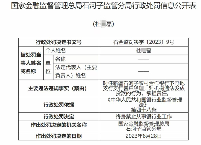 其中,新疆石河子农村合作银行因内控管理失效,案防工作流于形式,被罚人民币50万元;该行下野地支行因违法违规发放贷款,被罚人民币50万元;时任该行下野地支行客户经理的杜某磊对违法发放贷款的行为,承担责任,被罚终身禁止从事银行业工作。
