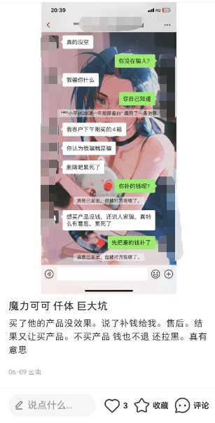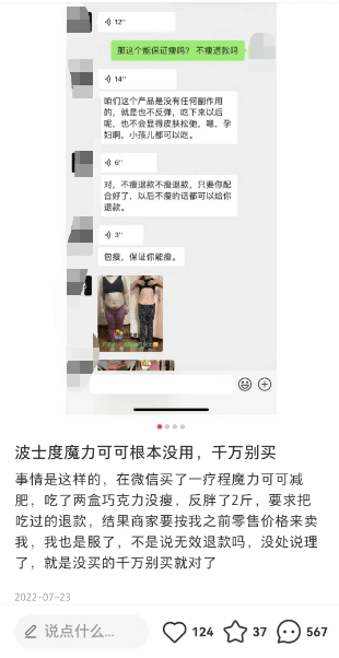 在追求减肥的路上,谁能不踩坑呢?有不少人在使用过魔力可可的产品后,“七天瘦10斤”的效果没看待,反而出现了身体不适?有网友在小红书发文称,在使用了魔力可可的产品没效果过跟卖产品的沟通,结果“钱也不退还拉黑”。而另一位网友称,在使用魔力可可的减肥巧克力以后,不但没瘦反而胖了两斤,在跟卖产品的沟通后仍然是拒绝退款。