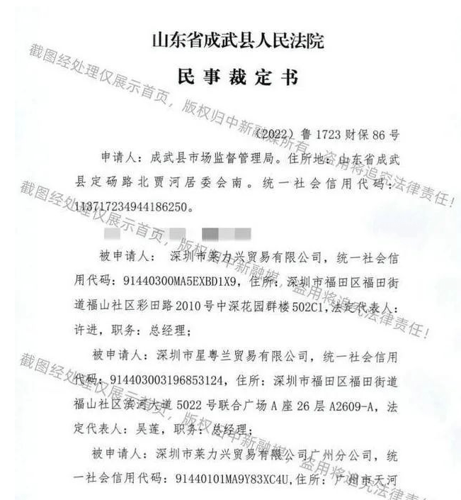 减肥产品无效,难免让人觉得糟心,但是魔力可可的问题不仅仅是这一点。2022年,成武县市场监督管理局在查处深圳市莱力兴贸易有限公司涉嫌传销一案以及关联方深圳市星粤兰贸易有限公司、深圳市莱力兴贸易有限公司广州分公司、乐意汇信息服务有限公司、吴婧、许爱萍时,为防止被申请人转移或者隐匿违法资金,向山东省成武县人民法院提出财产保全申请,请求冻结上述被申请人名下银行存款8500万元。目前已经解冻,但是涉及到的企业均已注销。
